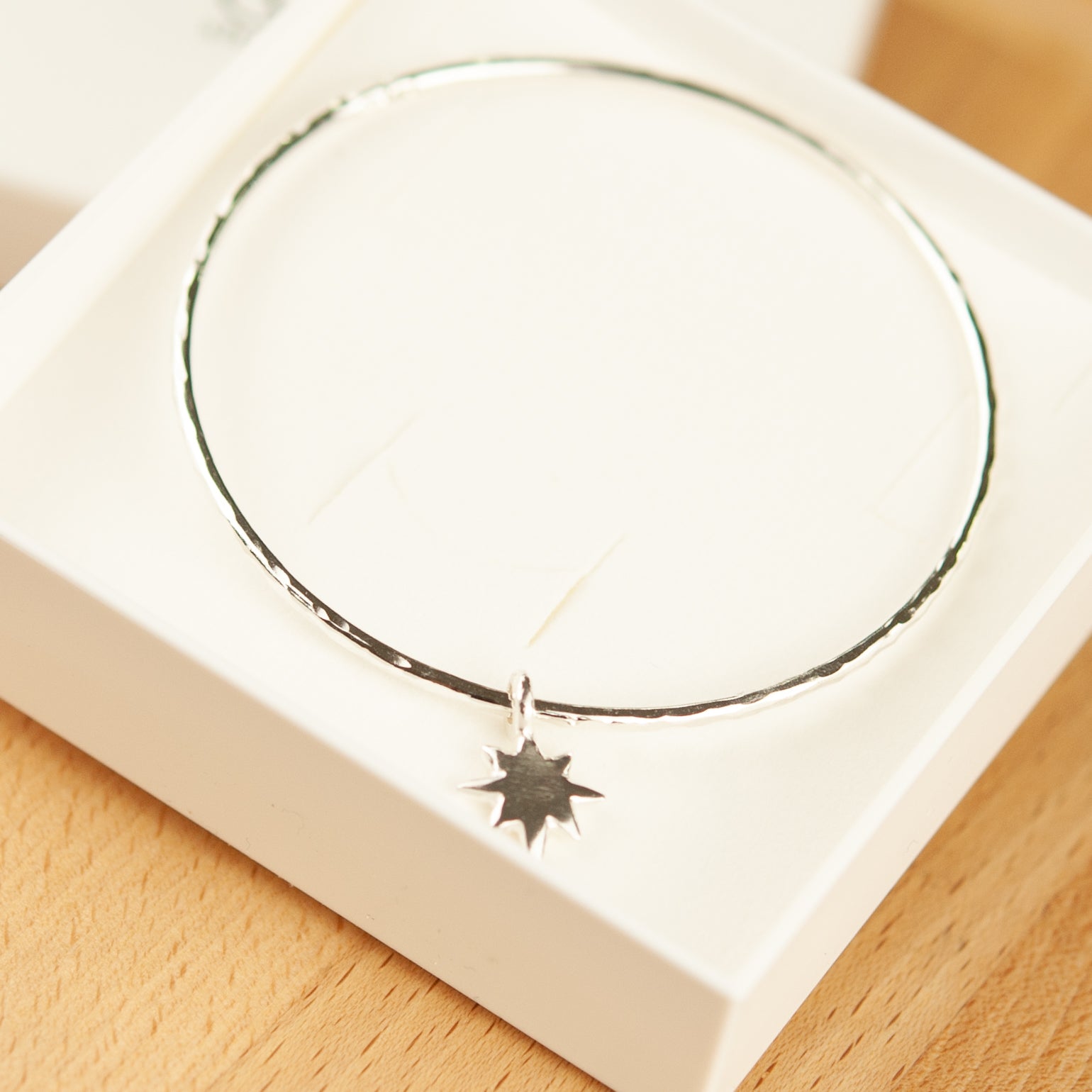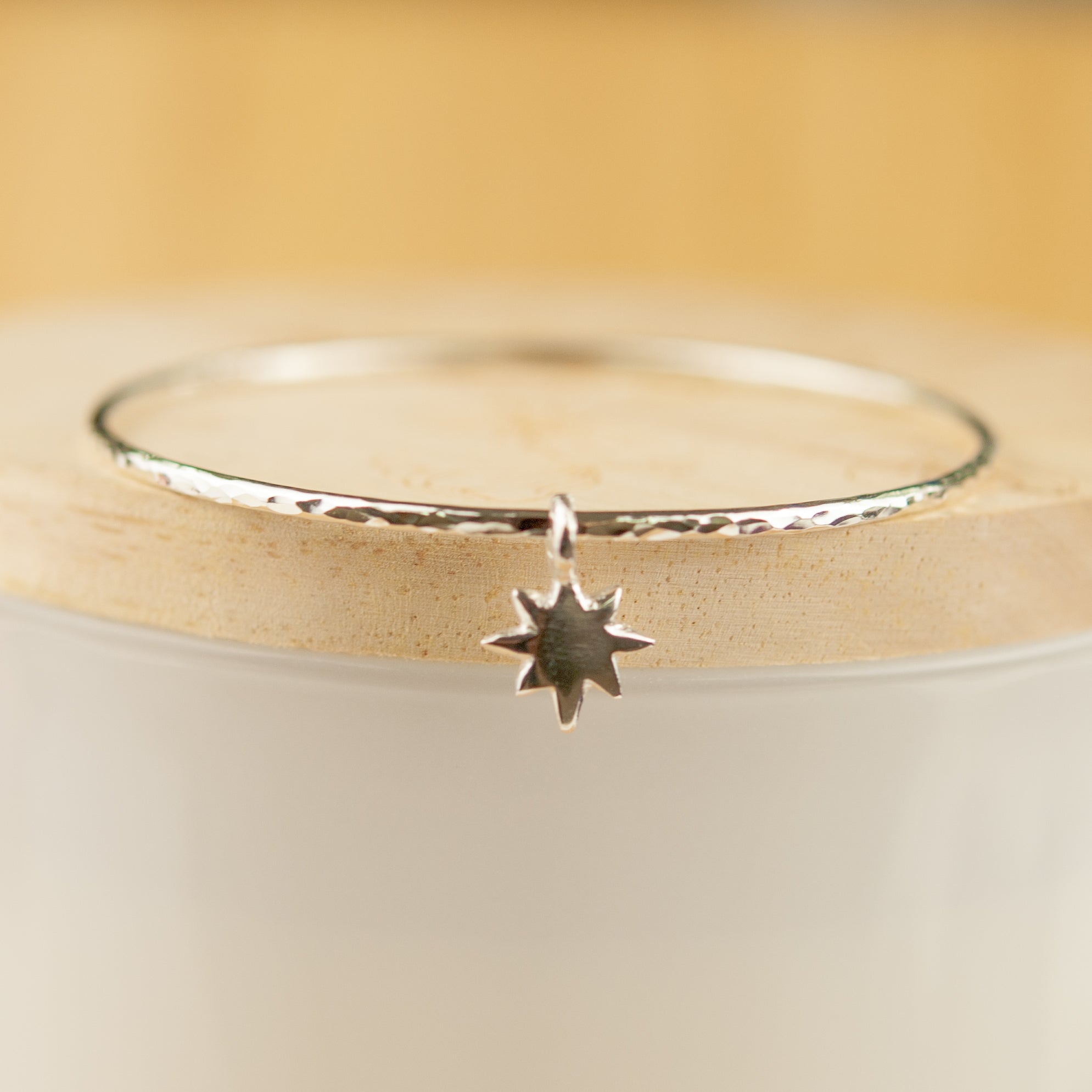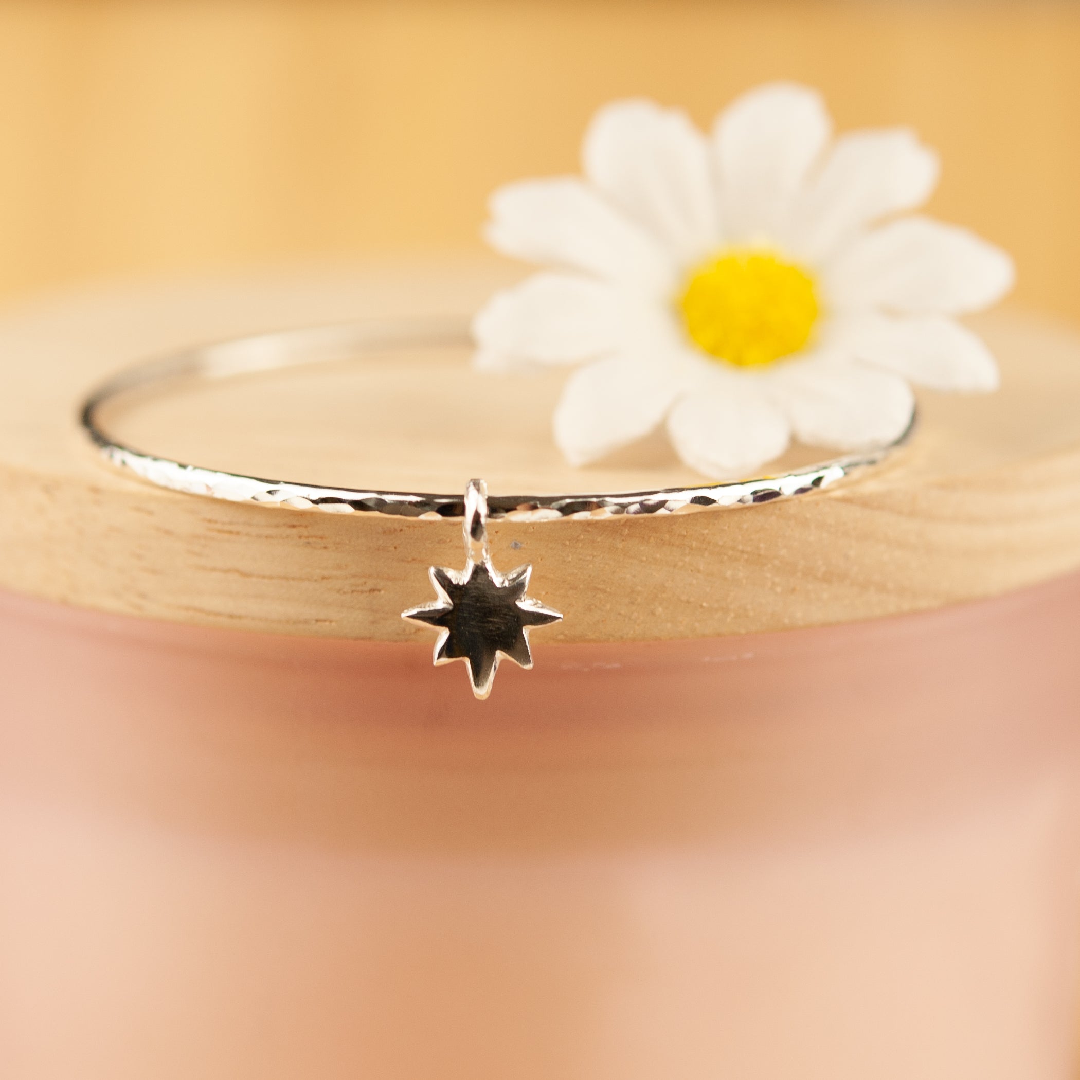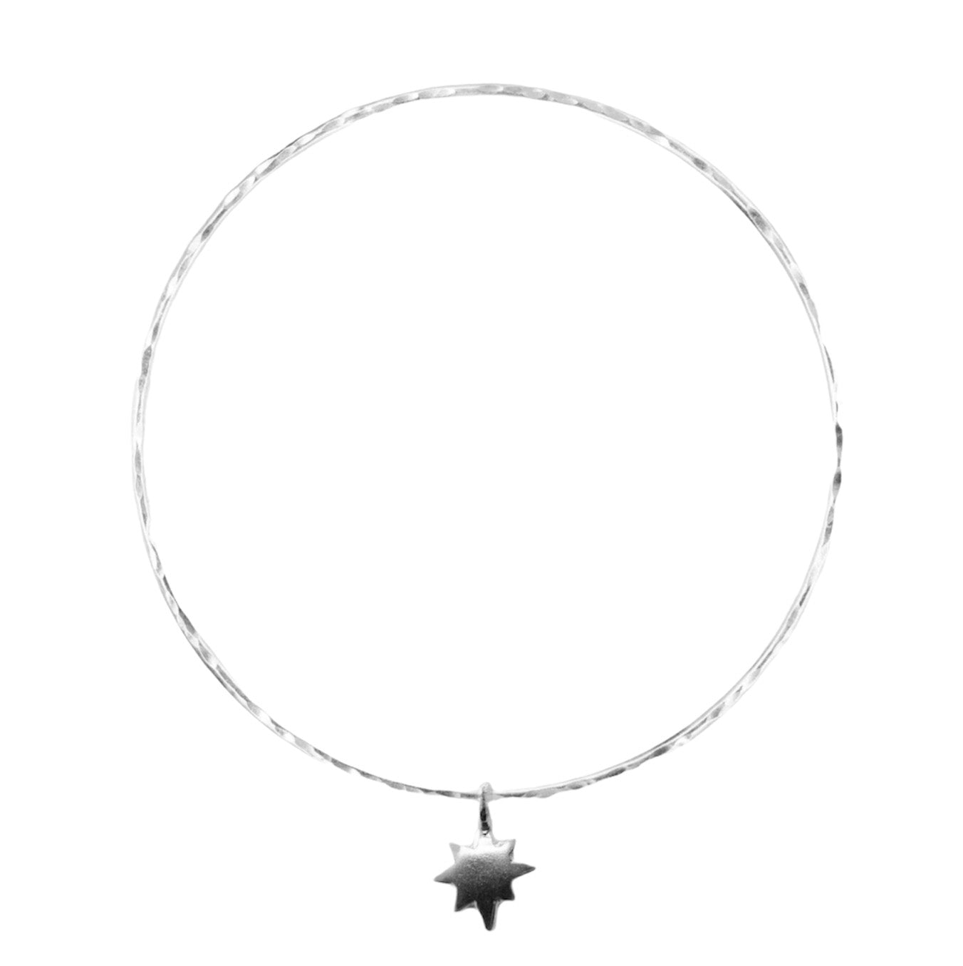 Belle & Bee 2mm hammered sterling silver bangle with a Baby North Star Charm, which captures this stars beauty. The North Star is the brightest in the Ursa Minor constellation, representing limitless possibilities and infinite wonder.